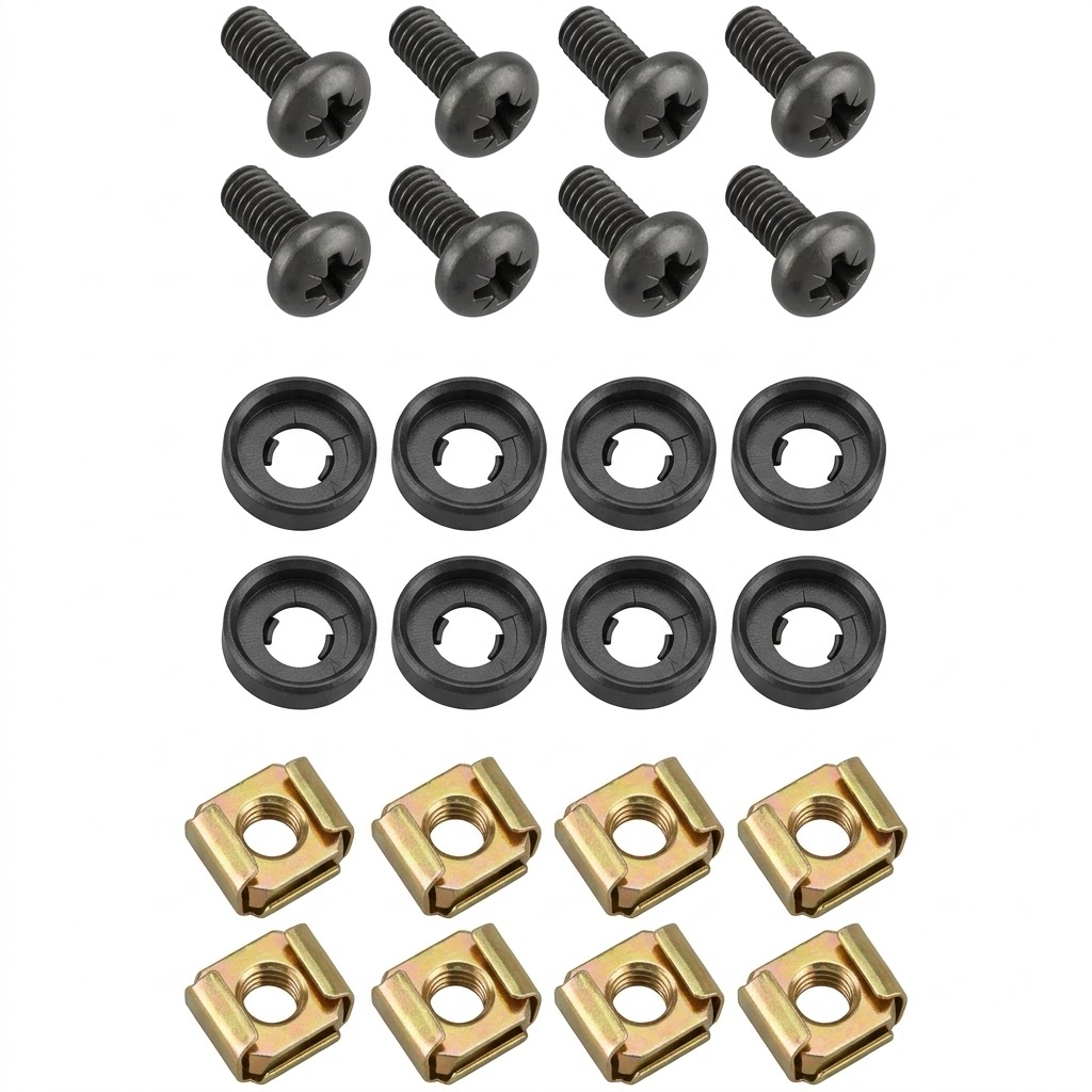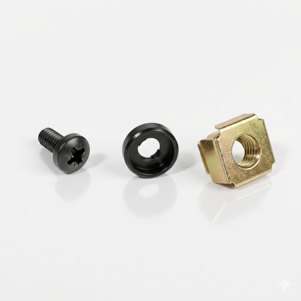 Vollständiges Montage-Kit: Profi-Set bestehend aus 100x M6 Käfigmuttern (Vierkantmuttern), 100x M6 Linsenkopfschrauben (20mm, Kreuzschlitz) und 100x Kunststoff-Unterlegscheiben zum Schutz Ihrer Geräte.