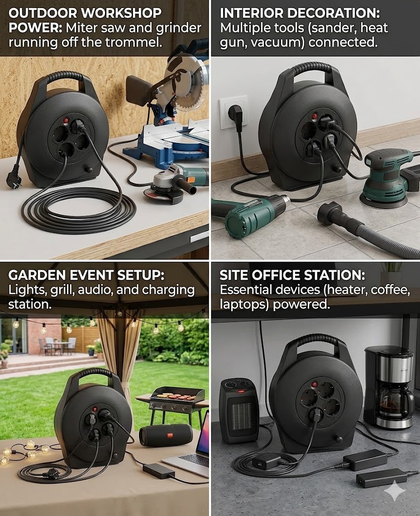 VIELSEITIGE STROMVERTEILUNG: Die kompakte 10m Kabeltrommel ist ideal für den Innenbereich (IP20) geeignet. Ausgestattet mit 4 Schutzkontaktsteckdosen bietet die schwarze Kabelbox ausreichend Anschlussmöglichkeiten für Haushalt und Hobby.