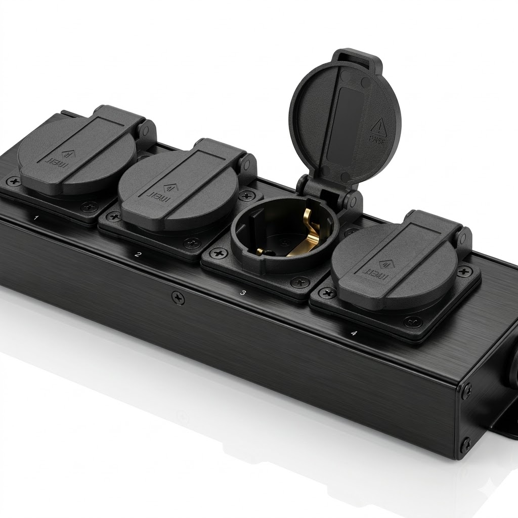 🛡️ 4x SCHUKO-STECKDOSEN MIT KLAPPDECKEL: Auf der Oberseite befinden sich vier Schutzkontakt-Steckdosen, die Ihr Licht- und Tonequipment konstant mit Strom versorgen. Die selbstschließenden Klappdeckel bieten dabei optimalen Schutz vor Staub und Fremdkörpern.
