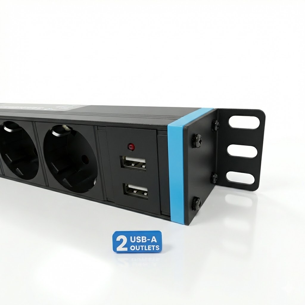 Die INSV1002 ist mehr als nur eine Steckdosenleiste: Sie kombiniert zuverlässige Stromverteilung mit praktischen Service-Features. Neben 8 Schutzkontakt-Steckdosen verfügt diese 19-Zoll-Leiste über zwei integrierte USB-A Buchsen.