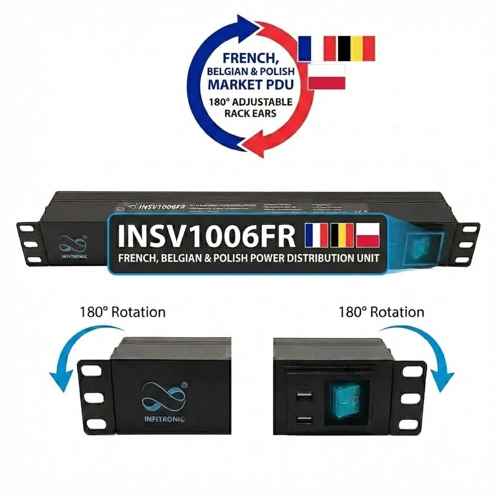 Die Infitronic INSV1006FR ist eine hochwertige 19-Zoll-Steckdosenleiste (1HE), die speziell für die Anforderungen in Frankreich, Belgien, Polen und weiteren Ländern mit der Steckdosen-Norm CEE 7/5 (Typ E) konzipiert wurde.