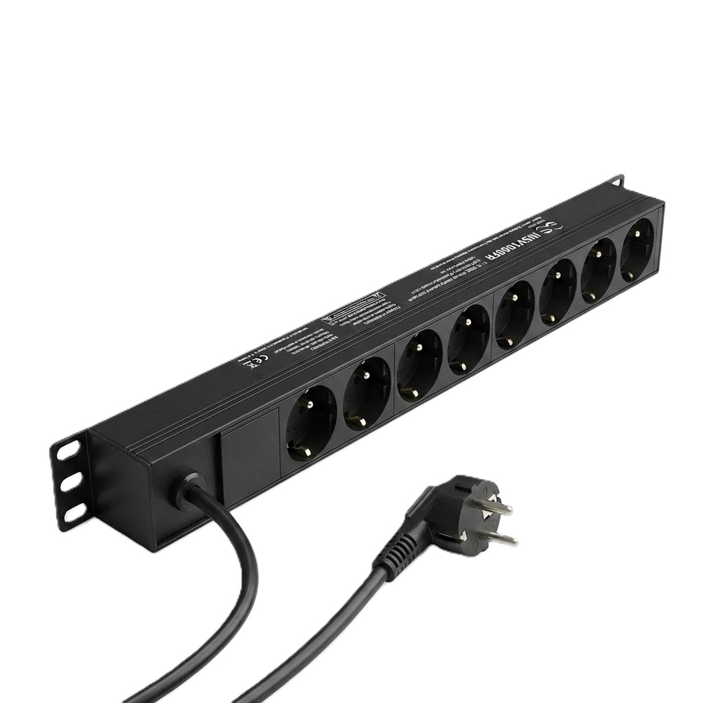 Sie bietet 8 Steckdosen mit dem charakteristischen Erdungsstift (Grounding Pin), die um 45° gedreht angeordnet sind. Dies ermöglicht den problemlosen Anschluss von Winkelsteckern, ohne benachbarte Buchsen zu verdecken. Das Gehäuse besteht aus einem robusten, schwarzen Aluminium-Strangpress-Profil und fügt sich nahtlos in professionelle Server- und Netzwerkschränke ein.